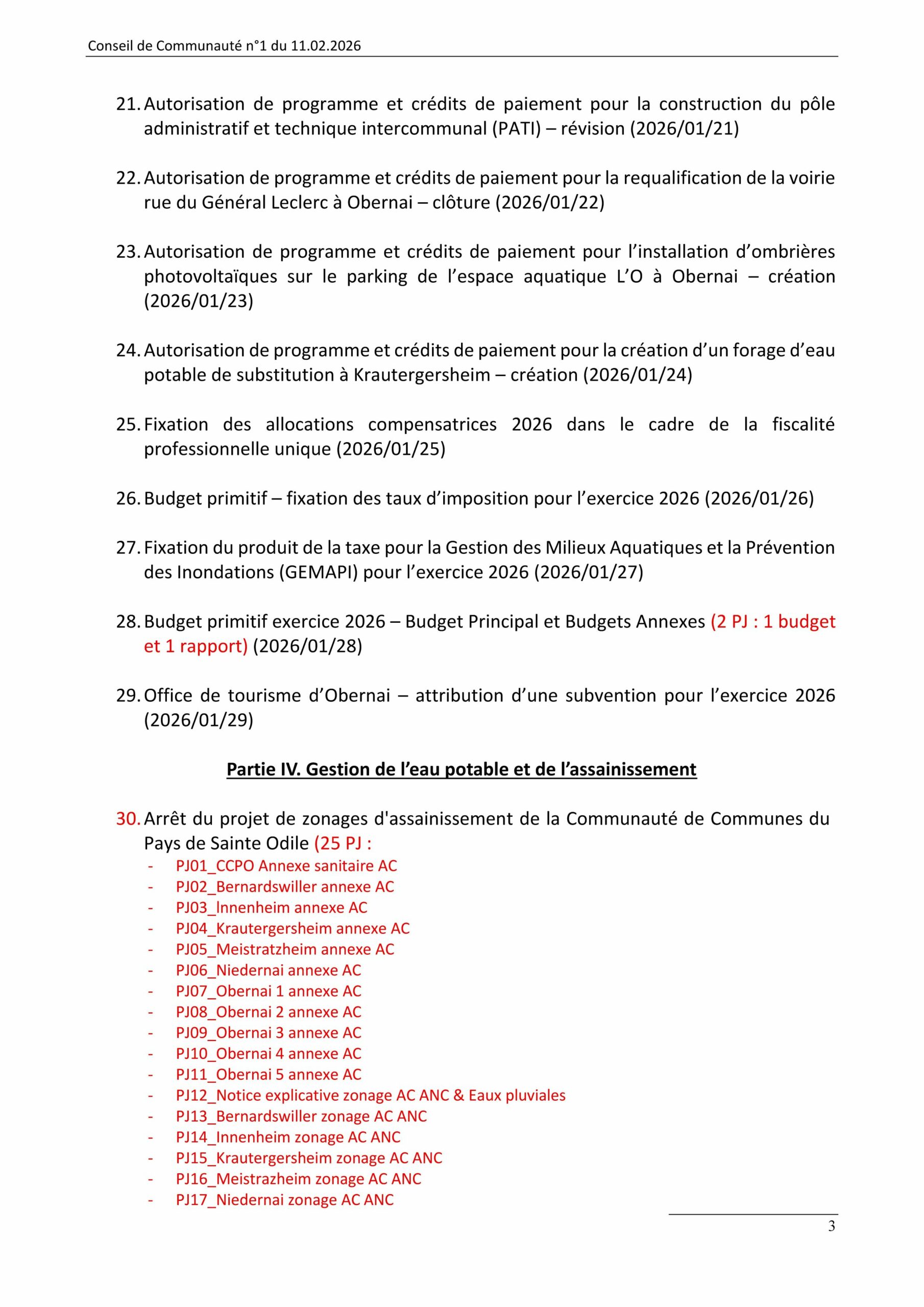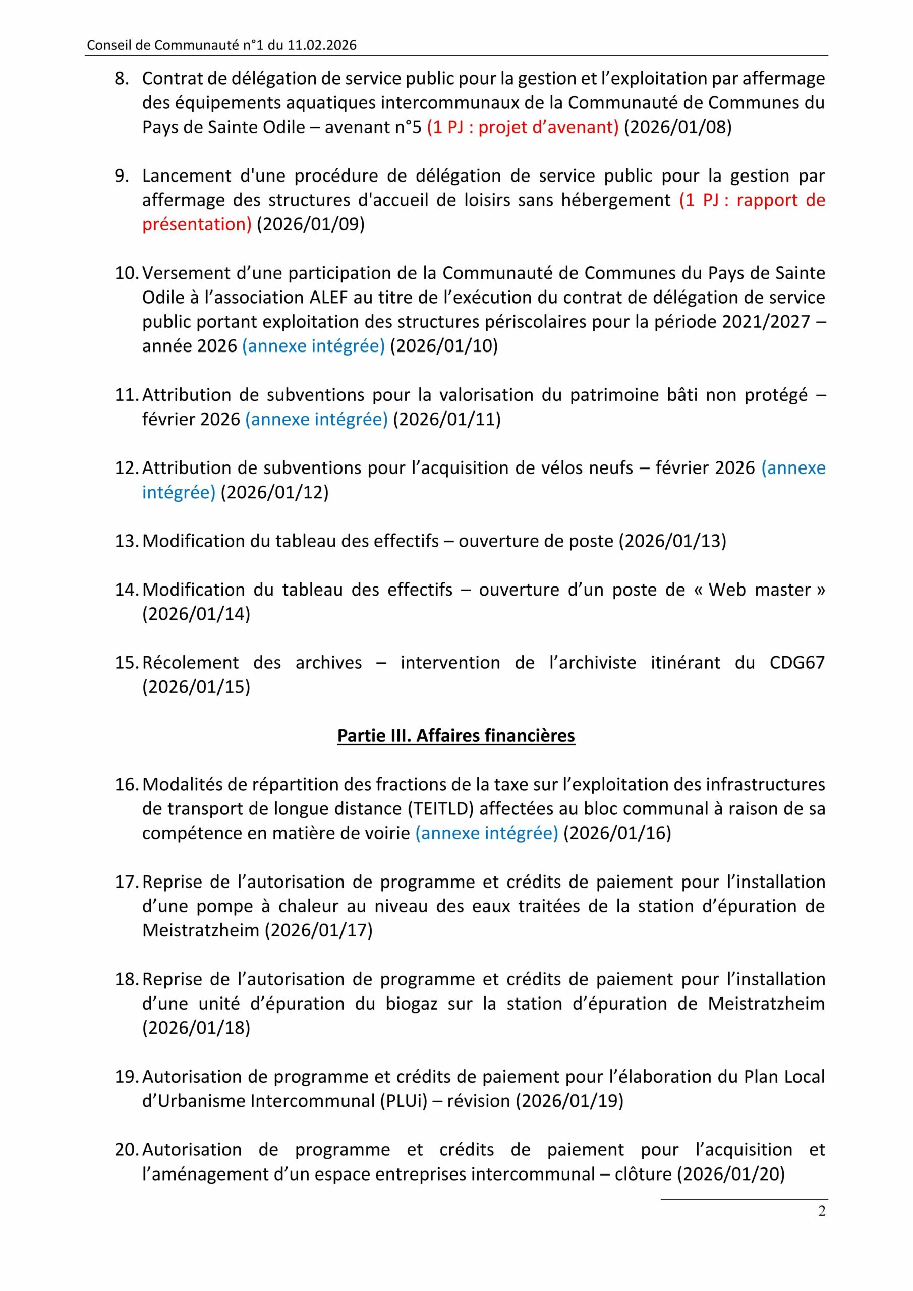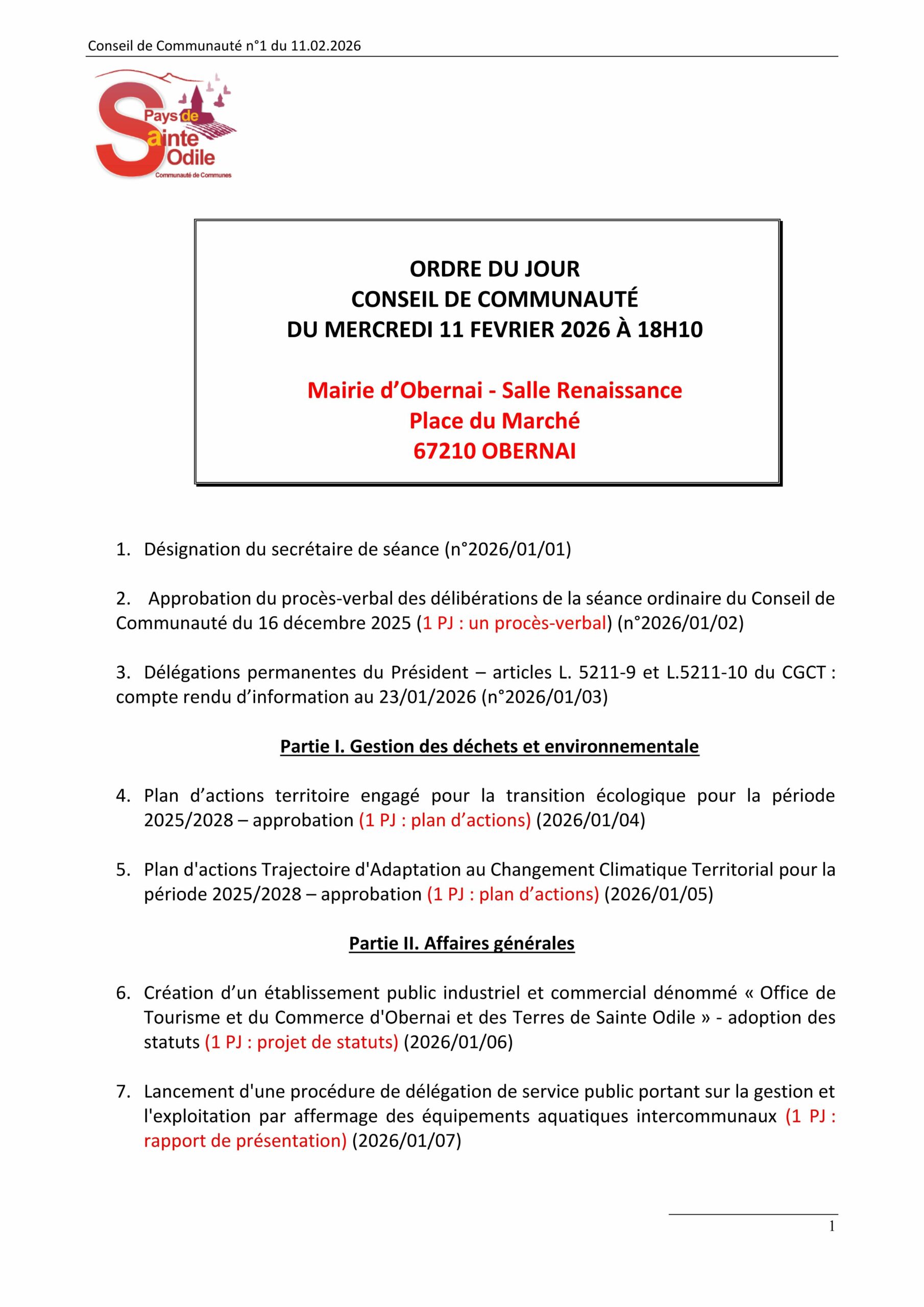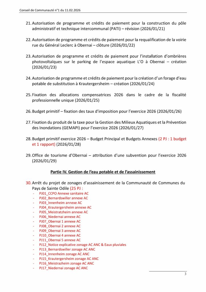 Consultez l’ordre du jour du dernier conseil de communauté de la mandature 2020-2026. Il se tiendra le mercredi 11 février 2026 à 18 h 10 en salle Renaissance de l’hôtel de ville d’Obernai.